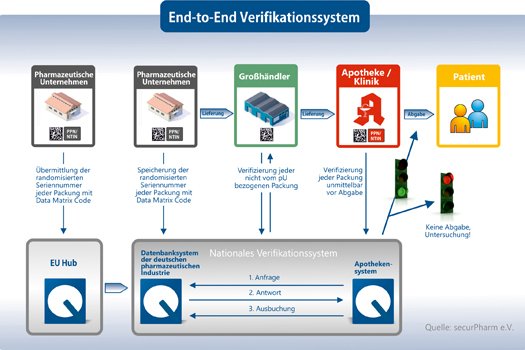 Zusätzlich erhält jede Arzneimittelpackung ein digitales Sicherheitsmerkmal. Dazu wird vom Hersteller auf der Verpackung ein individuelles Erkennungsmerkmal aufgebracht, das einzigartig ist und nur einmal verwendet werden kann. Somit ist das Medikament stets eindeutig erkennbar und nachzuverfolgen. Diese individuelle Nummer wird einmal als scanbarer 2D-Barcode (Data Matrix Code) und einmal in Klarschrift auf der Verpackung aufgebracht. Sie enthält den Produktcode, die Seriennummer, die Chargennummer sowie das Verfallsdatum. Diese Daten werden vom Hersteller im securPharm-System hinterlegt. In der Apotheke wird über den Scan des Data Matrix Codes vor der Abgabe des Medikaments an den Patienten die Echtheit des Medikaments geprüft. Dadurch werden die Daten der Packung mit den Daten in der securPharm-Datenbank abgeglichen. Das Ergebnis wird an die Apotheke zurückgemeldet. Dort kann man dann sehen, ob diese Packung schon einmal abgeben wurde. Wenn dies angezeigt wird, darf die Packung nicht an den Patienten abgegeben werden. Der Vorfall wird dann überprüft.