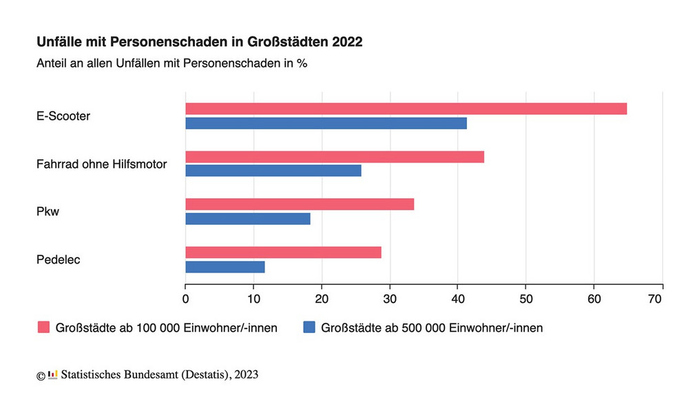 Sorgen bereiten vielen Verkehrsexperten die stark gestiegenen Unfallzahlen. 2022 wurde eine Steigerung der Unfälle mit Personenschäden um fast 50 Prozent auf 8.260 Fälle registriert. 11 Menschen kamen dabei zu Tode, 1.234 wurden schwer und 7.651 leicht verletzt. In den Großstädten ist die Zahl der Unfälle mit Personenschäden dabei am höchsten. Fast 65 Prozent geschehen in Städten mit mehr als 100.000 Einwohnern. 40 Prozent aller verunglückten E-Scooter-Nutzenden sind jünger als 25 Jahre. Die häufigsten Unfallursachen waren Alkohol sowie die Nutzung der falschen Fahrbahn oder der Gehwege. Viele Nutzer wissen nicht, dass sie mit ihrem elektrischen Tretroller Fahrradwege oder Schutzstreifen nutzen müssen. Falls diese nicht vorhanden sind, müssen sie auf Fahrbahnen oder Seitenstreifen ausweichen. Gänzlich verboten ist das Fahren auf Gehwegen. Auch das Fahren unter Alkoholeinfluss ist bei E-Scooter-Fahrerinnen und -Fahrern deutlich verbreiteter als bei den Nutzern anderer Verkehrsmittel. Bei Kontrollen stellte die Polizei bei 18 Prozent der E-Scooter-Nutzer Fahren unter Alkoholeinfluss fest. Zum Vergleich: Im selben Zeitraum waren es bei den Fahrradfahrenden nur 8,2 Prozent und bei und bei zulassungsfreien Krafträdern wie Mofas, S-Pedelecs und Kleinkrafträdern 7,8 Prozent.