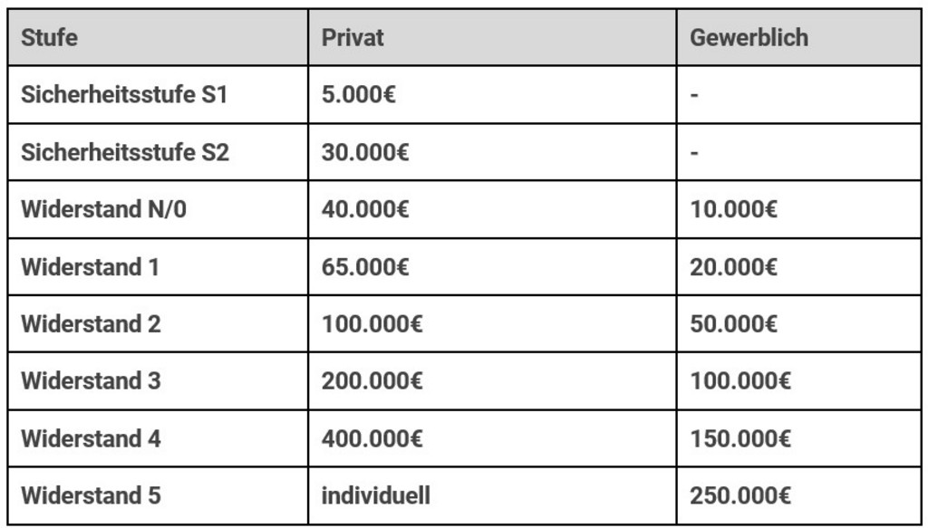 Die Sicherheitsstufen geben auch Auskunft darüber, mit welchen Versicherungssummen die Inhalte eines Tresors abgesichert werden können. Höhere Widerstandsgrade ermöglichen entsprechend höhere Versicherungssummen. Dabei unterscheiden Versicherungen zwischen gewerblicher und privater Nutzung.